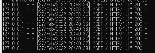 Ctrl + C로 종료 후 Flask run 명령어를 다시 실행하니까 200이 뜨긴 했다.